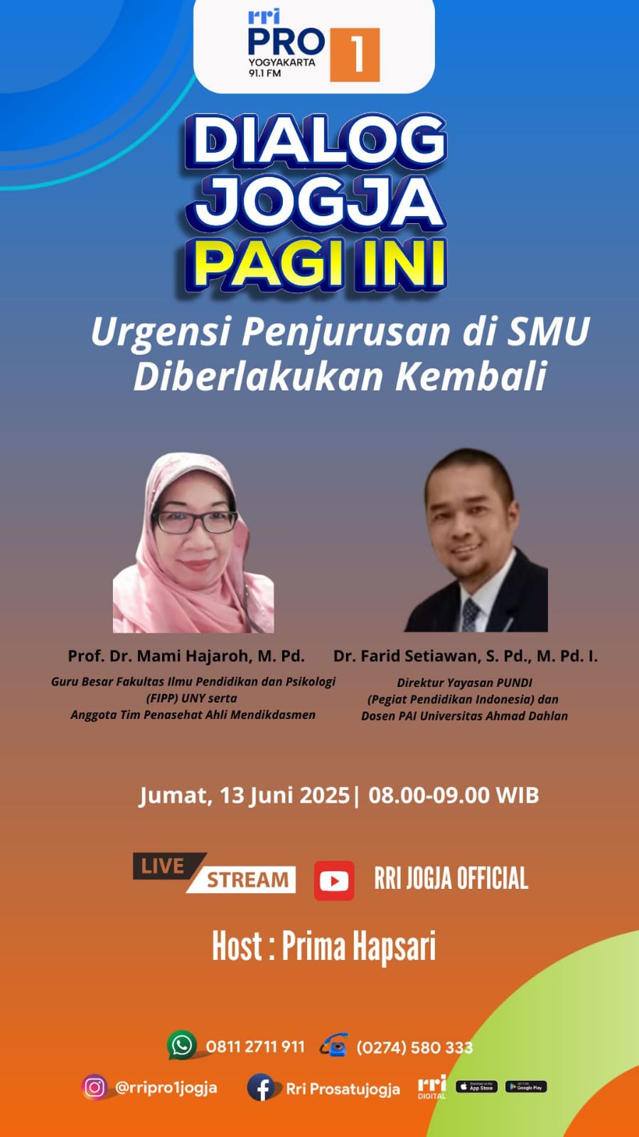 Yogyakarta – RRI Pro 1 Yogyakarta 91.1 FM akan menggelar dialog publik bertajuk “Urgensi Penjurusan di SMU Diberlakukan Kembali” pada Jumat, 13 Juni 2025, pukul 08.00 hingga 09.00 WIB.
